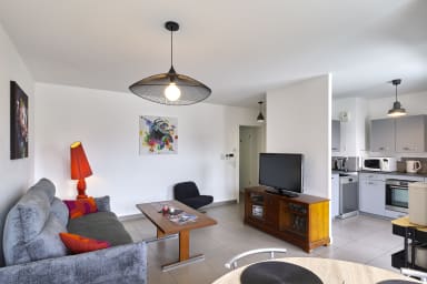 Dès l’entrée, vous découvrez un vaste salon-séjour baigné de lumière, ouvert sur un premier balcon agréable.