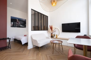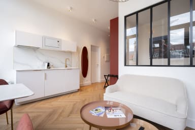 L’appartement est situé dans un immeuble ancien et offre tout le confort moderne : un espace salon avec TV, cuisine toute équipée, espace de travail pour ordinateur, il est pensé pour allier fonctionnalité et autonomie, grâce à un accès sans contact et une arrivée facilitée.