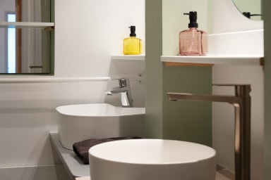 Ce grand appartement a été conçu pour accueillir confortablement jusqu’à 6 personnes. Il dispose de 3 chambres indépendantes, chacune équipée d’un espace de travail dédié – idéal pour les voyageurs professionnels ou les étudiants en déplacement. La cuisine est entièrement équipée, avec une grande table conviviale pour 6 personnes. La salle de bain spacieuse dispose de 3 vasques et de 2 douches individuelles, un véritable plus pour les séjours en groupe. Les fenêtres des chambres offrent une vue dégagée sans vis-à-vis, notamment sur la fontaine emblématique de la ville.