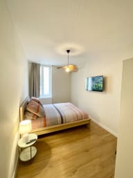 L’appartement dispose d’une chambre avec lit double, d’un salon avec un canapé convertible en banquette (avec surmatelas), d’une cuisine entièrement équipée, d’un espace repas convivial, d’une salle de bain moderne avec douche, et d’un Wi-Fi haut débit. Parfait pour un séjour court ou moyen, en mode détente ou télétravail.
