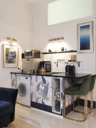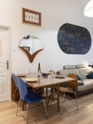pièce à vivre de l’un des appartements, avec sa cuisine à portée de main, ou manger séparément grâce aux 2 cuisines.