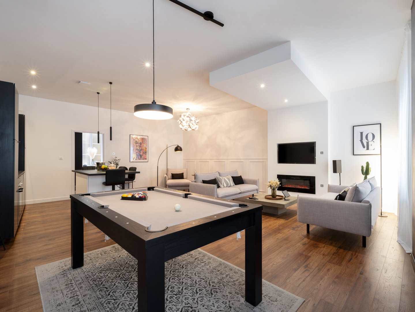 - Elegant living room with pool table and electric fireplace – perfect for cozy or social moments.